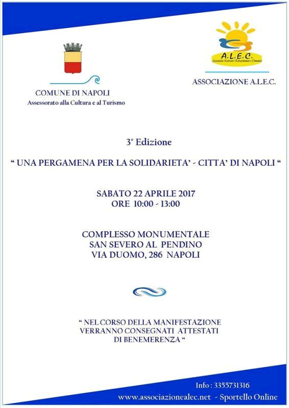 3° Edizione “Una Pergamena per la Solidarietà - Città di Napoli Si è svolto presso il Complesso Monumentale di San Severo al Pendino – Via Duomo,286 Napoli , Sabato 22 Aprile 2017 dalle ore 10:00 alle ore 13:00 la Terza Edizione “ Una Pergamena per la Solidarietà- Città di Napoli”. L’evento è stato promosso dall’ Associazione A.L.E.C e patrocinata dall’Assessorato alla Cultura e Turismo del Comune di Napoli.