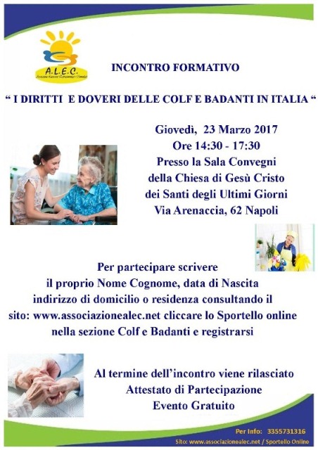 L’ Associazione ALEC tutte le colf e badanti giovedi 23 Marzo 2017 dalle ore 14:30 alle ore 17:30 a partecipare a questo incontro che si terrà a Napoli presso la Sala delle Conferenze della Chiesa dei Santi degli Utlimi giorni con sede in Napoli alla Via Arenaccia 62, a circa 200 mt dalla stazione Centrale