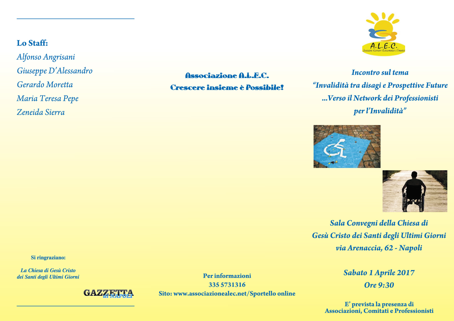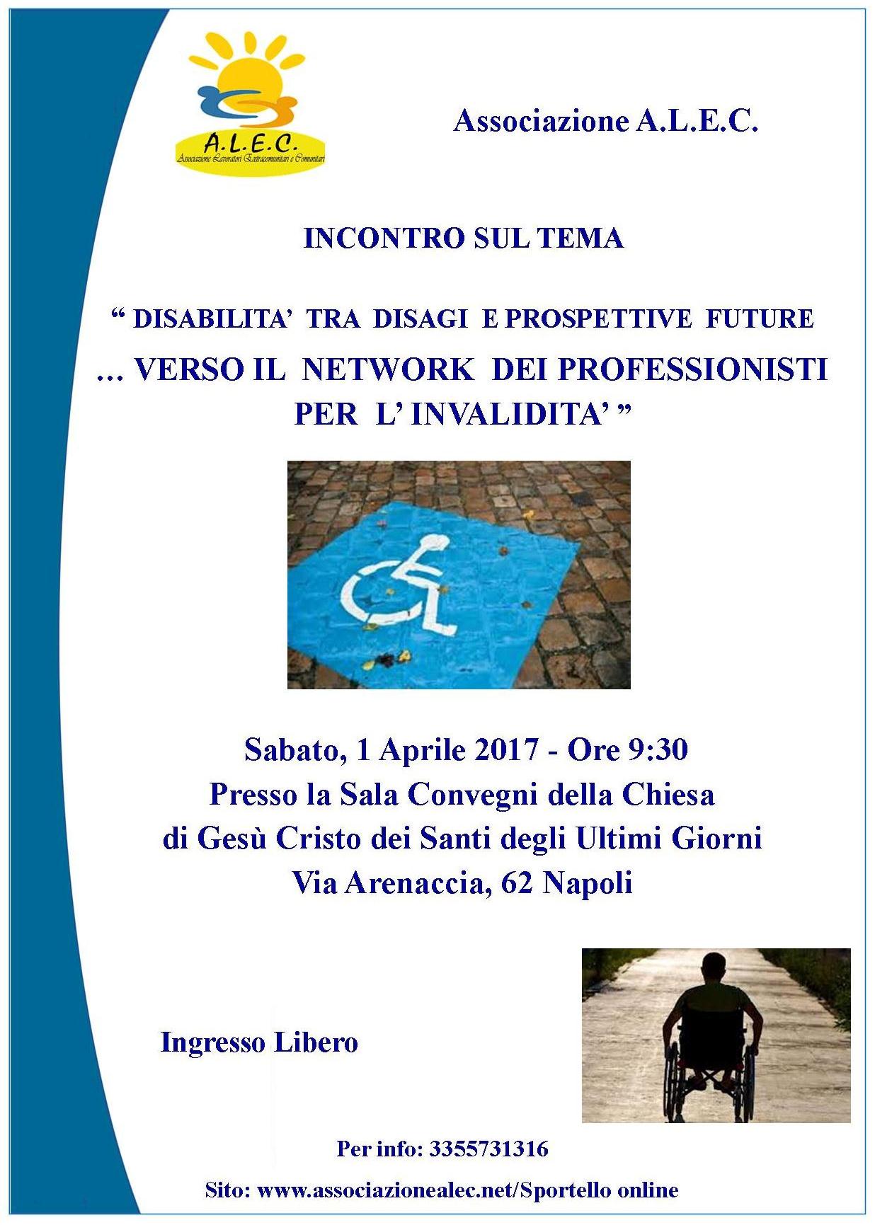 Sabato 1 Aprile 2017 - ore 09:30 a Napoli, in Via Arenaccia 62 – presso la Sala Convegni della Chiesa di Gesù Cristo dei Santi degli Ultimi Giorni, incontro promosso dall’Associazione Alec intitolato “Disabilità tra disagi e prospettive future…verso il Network dei professionisti per l’Invalidità “ interverranno: